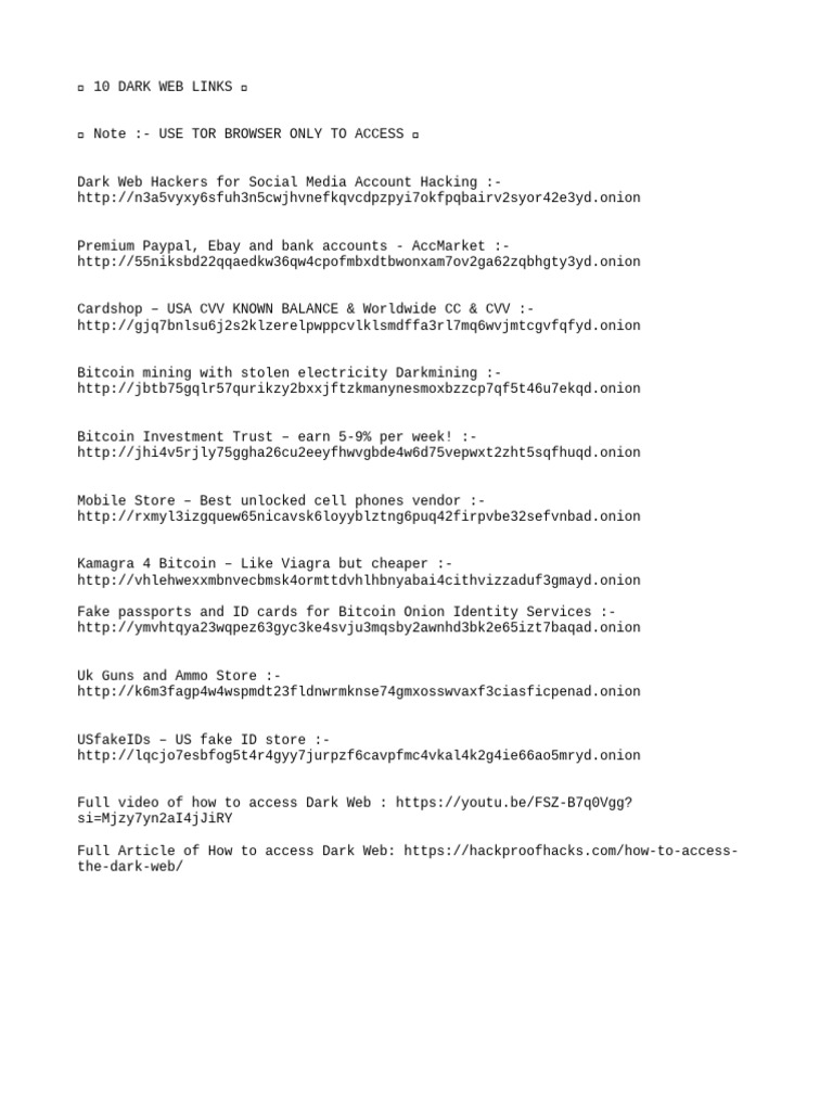 The document lists ten dark web links that provide access to various illegal services, including social media account hacking, stolen financial accounts, and counterfeit identification. Users are advised to use the TOR browser to access these links safely. Additionally, it includes resources for learning how to access the dark web through a video and an article.