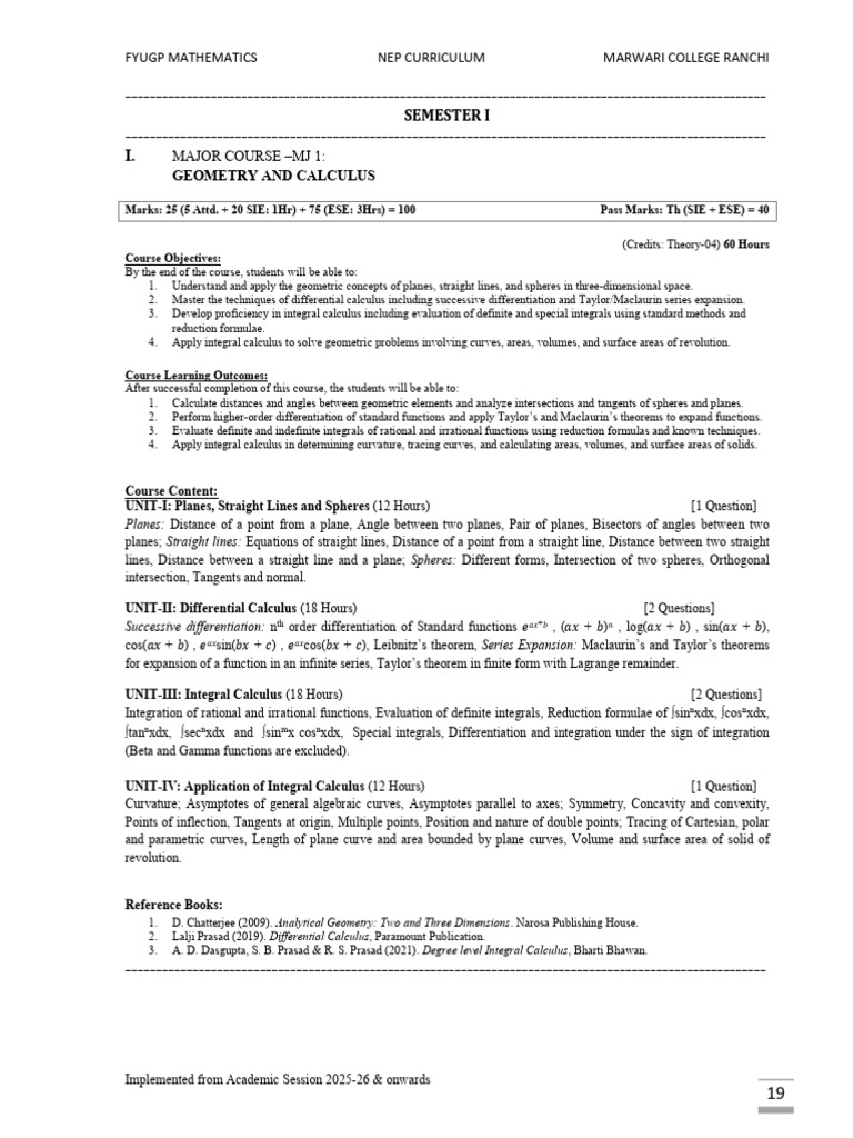 FYUGP MATHEMATICS NEP CURRICULUM MARWARI COLLEGE RANCHI