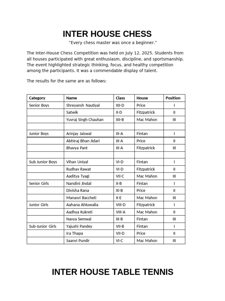 The Inter-House Chess Competition was held on July 12, 2025. Students from