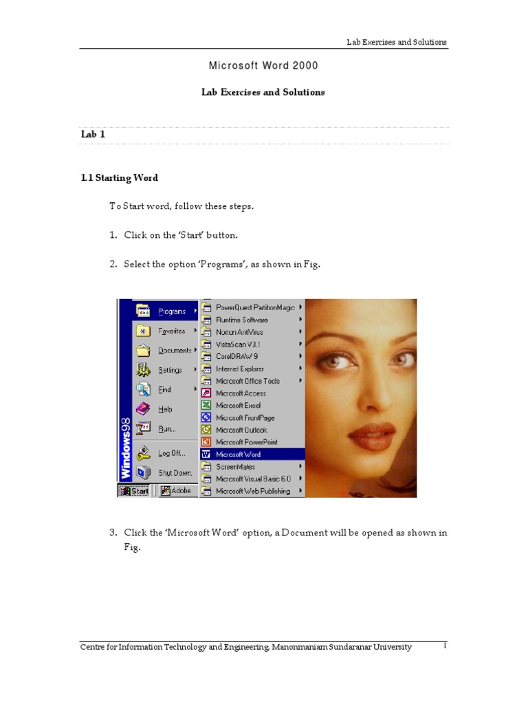 1.1 Starting Word To Start word, follow these steps. 1. Click on the Start button. 2. Select the option Programs, as shown in Fig.
