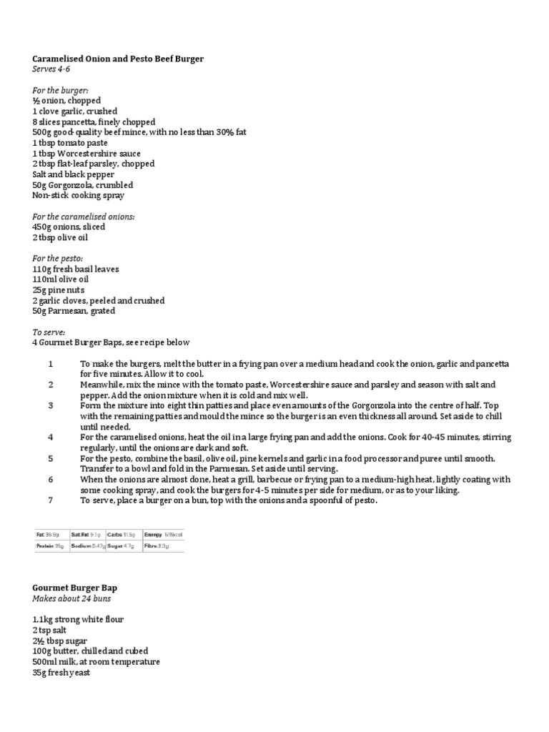 , crushed 8 slices pancetta, finely chopped 500g good-quality beef mince, with no less than 30% fat 1 tbsp tomato paste 1 tbsp Worcestershire sauce 2 tbsp flat-leaf parsley, chopped Salt and black pepper 50g Gorgonzola, crumbled Non-stick cooking spray For the caramelised onions: 450g onions, sliced 2 tbsp olive oil For the pesto: 110g fresh basil leaves 110ml olive oil 25g pine nuts 2 garlic cloves, peeled and crushed 50g Parmesan, grated To serve: 4 Gourmet Burger Baps, see recipe below 1 2 3 4 5 6 7 To make the burgers, melt the butter in a frying pan over a medium head and cook the onion, garlic and pancetta for five minutes. Allow it to cool. Meanwhile, mix the mince with the tomato paste, Worcestershire sauce and parsley and season with salt and pepper. Add the onion mixture when it is cold and mix well. Form the mixture into eight thin patties and place even amounts of the Gorgonzola into the centre of half. Top with the remaining patties and mould the mince so the burger is an even thickness all around. Set aside to chill until needed. For the caramelised onions, heat the oil in a large frying pan and add the onions. Cook for 40-45 minutes, stirring regularly, until the onions are dark and soft. For the pesto, combine the basil, olive oil, pine kernels and garlic in a food processor and puree until smooth. Transfer to a bowl and fold in the Parmesan. Set aside until serving. When the onions are almost done, heat a grill, barbecue or frying pan to a medium-high heat, lightly coating with some cooking spray, and cook the burgers for 4-5 minutes per side for medium, or as to your liking. To serve, place a burger on a bun, top with the onions and a spoonful of pesto.