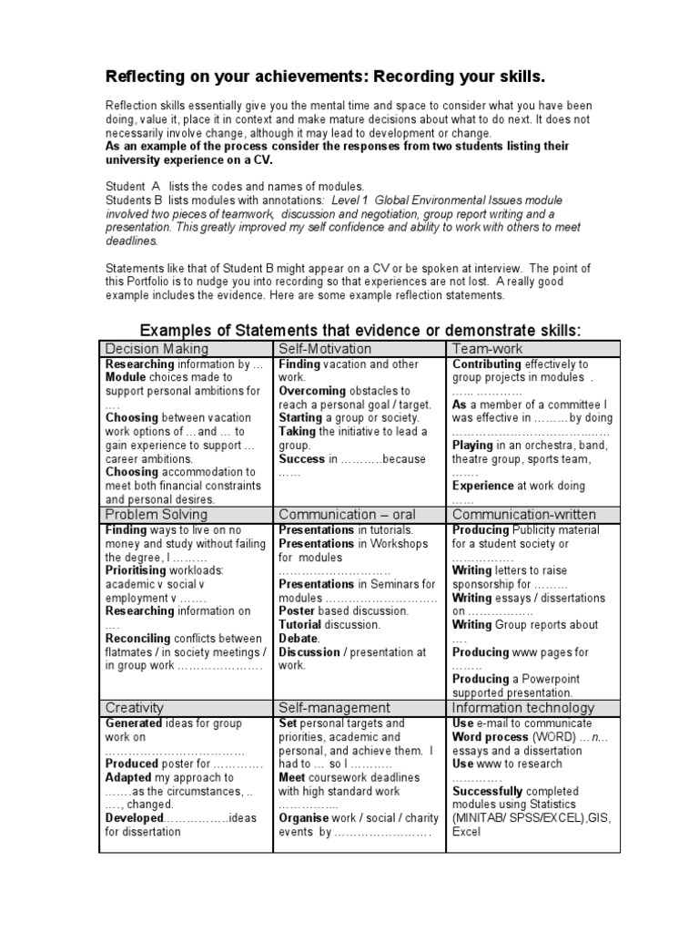 Reflection skills essentially give you the mental time and space to consider what you have been doing, value it, place it in context and make mature decisions about what to do next. It does not necessarily involve change, although it may lead to development or change. As an example of the process consider the responses from two students listing their university experience on a CV. Student A lists the codes and names of modules. Students B lists modules with annotations: Level 1 Global Environmental Issues module involved two pieces of teamwork, discussion and negotiation, group report writing and a presentation. This greatly improved my self confidence and ability to work with others to meet deadlines. Statements like that of Student B might appear on a CV or be spoken at interview. The point of this Portfolio is to nudge you into recording so that experiences are not lost. A really good example includes the evidence. Here are some example reflection statements.