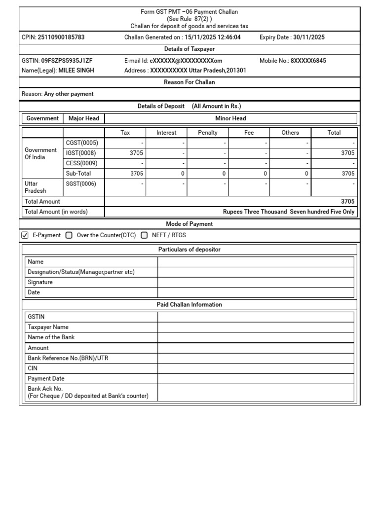 CPIN: 25110900185783 Challan Generated on : 15/11/2025 [Link] Expiry Date : 30/11/2025