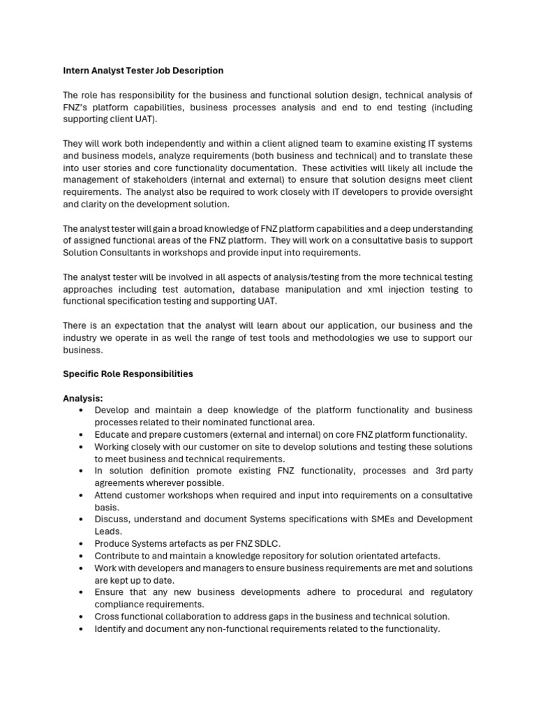 Intern Analyst Tester Job Description