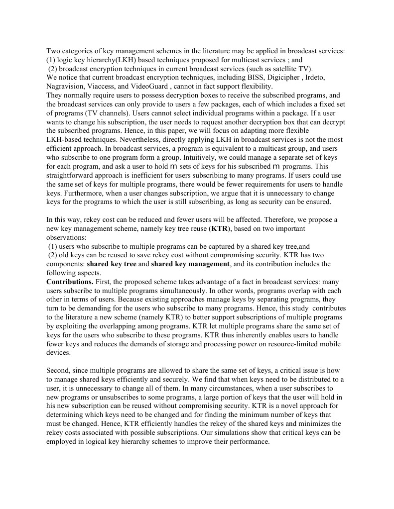based techniques proposed for multicast services ; and (2) broadcast encryption techniques in current broadcast services (such as satellite TV). We notice that current broadcast encryption techniques, including BISS, Digicipher , Irdeto, Nagravision, Viaccess, and VideoGuard , cannot in fact support flexibility. They normally require users to possess decryption boxes to receive the subscribed programs, and the broadcast services can only provide to users a few packages, each of which includes a fixed set of programs (TV channels). Users cannot select individual programs within a package. If a user wants to change his subscription, the user needs to request another decryption box that can decrypt the subscribed programs. Hence, in this paper, we will focus on adapting more flexible LKH-based techniques. Nevertheless, directly applying LKH in broadcast services is not the most efficient approach. In broadcast services, a program is equivalent to a multicast group, and users who subscribe to one program form a group. Intuitively, we could manage a separate set of keys for each program, and ask a user to hold m sets of keys for his subscribed m programs. This straightforward approach is inefficient for users subscribing to many programs. If users could use the same set of keys for multiple programs, there would be fewer requirements for users to handle keys. Furthermore, when a user changes subscription, we argue that it is unnecessary to change keys for the programs to which the user is still subscribing, as long as security can be ensured. In this way, rekey cost can be reduced and fewer users will be affected. Therefore, we propose a new key management scheme, namely key tree reuse (KTR), based on two important observations: (1) users who subscribe to multiple programs can be captured by a shared key tree,and (2) old keys can be reused to save rekey cost without compromising security. KTR has two components: shared key tree and shared key management, and its contribution includes the following aspects. Contributions. First, the proposed scheme takes advantage of a fact in broadcast services: many users subscribe to multiple programs simultaneously. In other words, programs overlap with each other in terms of users. Because existing approaches manage keys by separating programs, they turn to be demanding for the users who subscribe to many programs. Hence, this study contributes to the literature a new scheme (namely KTR) to better support subscriptions of multiple programs by exploiting the overlapping among programs. KTR let multiple programs share the same set of keys for the users who subscribe to these programs. KTR thus inherently enables users to handle fewer keys and reduces the demands of storage and processing power on resource-limited mobile devices. Second, since multiple programs are allowed to share the same set of keys, a critical issue is how to manage shared keys efficiently and securely. We find that when keys need to be distributed to a user, it is unnecessary to change all of them. In many circumstances, when a user subscribes to new programs or unsubscribes to some programs, a large portion of keys that the user will hold in his new subscription can be reused without compromising security. KTR is a novel approach for determining which keys need to be changed and for finding the minimum number of keys that must be changed. Hence, KTR efficiently handles the rekey of the shared keys and minimizes the rekey costs associated with possible subscriptions. Our simulations show that critical keys can be employed in logical key hierarchy schemes to improve their performance.