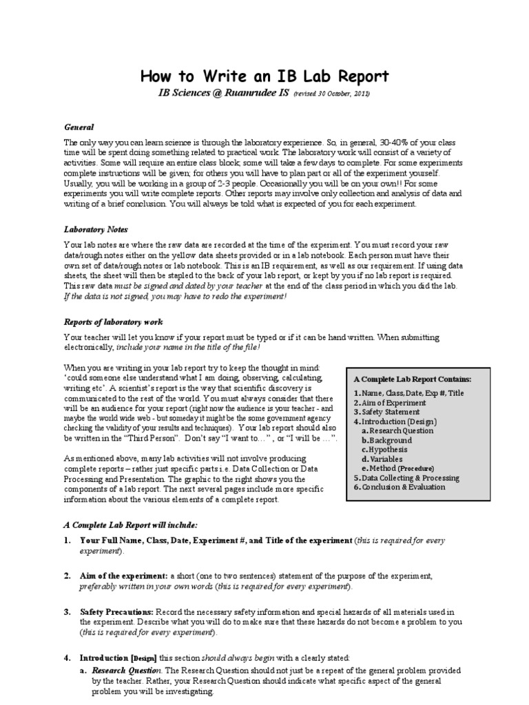 General The only way you can learn science is through the laboratory experience. So, in general, 30-40% of your class time will be spent doing something related to practical work. The laboratory work will consist of a variety of activities. Some will require an entire class block; some will take a few days to complete. For some experiments complete instructions will be given; for others you will have to plan part or all of the experiment yourself. Usually, you will be working in a group of 2-3 people. Occasionally you will be on your own!! For some experiments you will write complete reports. Other reports may involve only collection and analysis of data and writing of a brief conclusion. You will always be told what is expected of you for each experiment. Laboratory Notes Your lab notes are where the raw data are recorded at the time of the experiment. You must record your raw data/rough notes either on the yellow data sheets provided or in a lab notebook. Each person must have their own set of data/rough notes or lab notebook. This is an IB requirement, as well as our requirement. If using data sheets, the sheet will then be stapled to the back of your lab report, or kept by you if no lab report is required. This raw data must be signed and dated by your teacher at the end of the class period in which you did the lab. If the data is not signed, you may have to redo the experiment! Reports of laboratory work Your teacher will let you know if your report must be typed or if it can be hand written. When submitting electronically, include your name in the title of the file! When you are writing in your lab report try to keep the thought in mind: could someone else understand what I am doing, observing, calculating, writing etc. A scientists report is the way that scientific discovery is communicated to the rest of the world. You must always consider that there will be an audience for your report (right now the audience is your teacher - and