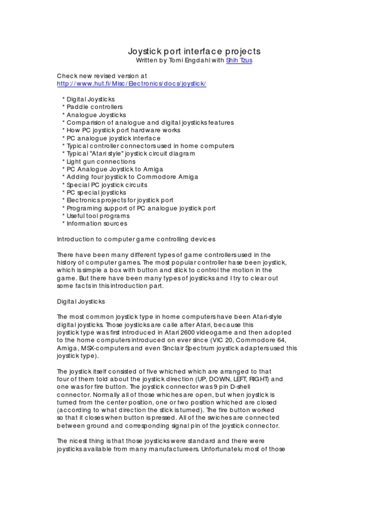 Written by Tomi Engdahl with Shih Tzus Check new revised version at http://www.hut.fi/Misc/Electronics/docs/joystick/ * Digital Joysticks * Paddle controllers * Analogue Joysticks * Comparision of analogue and digital joysticks features * How PC joystick port hardware works * PC analogue joystick interface * Typical controller connectors used in home computers * Typical "Atari style" joystick circuit diagram * Light gun connections * PC Analogue Joystick to Amiga * Adding four joystick to Commodore Amiga * Special PC joystick circuits * PC special joysticks * Electronics projects for joystick port * Programing support of PC analogue joystick port * Useful tool programs * Information sources Introduction to computer game controlling devices There have been many different types of game controllers used in the history of computer games. The most popular controller hase been joystick, which is simple a box with button and stick to control the motion in the game. But there have been many types of joysticks and I try to clear out some facts in this introduction part. Digital Joysticks The most common joystick type in home computers have been Atari-style digital joysticks. Those joysticks are calle after Atari, because this joystick type was first introduced in Atari 2600 videogame and then adopted to the home computers introduced on ever since (VIC 20, Commodore 64, Amiga, MSX-computers and even Sinclair Spectrum joystick adapters used this joystick type). The joystick itself consisted of five whiched which are arranged to that four of them told about the joystick direction (UP, DOWN, LEFT, RIGHT) and one was for fire button. The joystick connector was 9 pin D-shell connector. Normally all of those whiches are open, but when joystick is turned from the center position, one or two position whiched are closed (according to what direction the stick is turned). The fire button worked so that it closes when button is pressed. All of the swiches are connected between ground and corresponding signal pin of the joystick connector. The nicest thing is that those joysticks were standard and there were joysticks available from many manufactureers. Unfortunatelu most of those