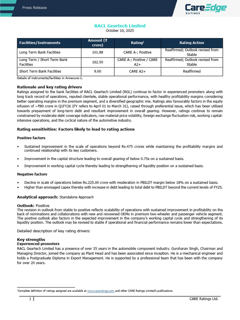 Ratings assigned to the bank facilities of RACL Geartech Limited (RGL) continue to factor in experienced promoters along with