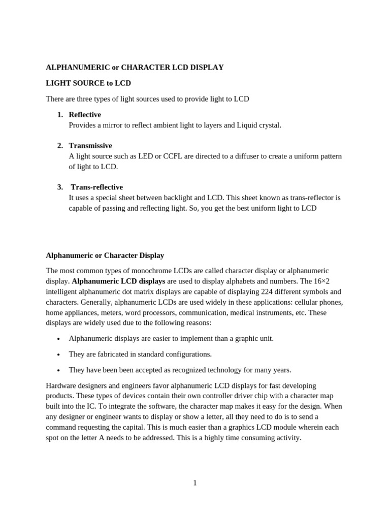 The most common types of monochrome LCDs are called character display or alphanumeric