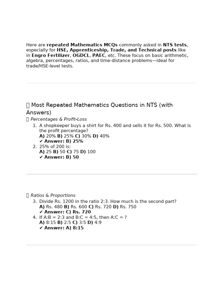 Mathematics repeated questions in NTS like HSE test apprenticeship,trade