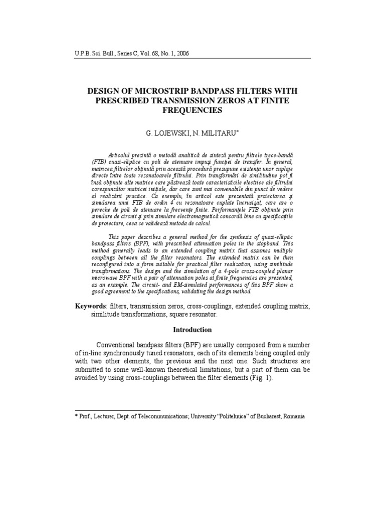 1. R. Cameron, General Coupling Matrix Synthesis Methods for Chebyshev Filtering Functions, in IEEE Trans. on MTT, vol. 47, no. 4, Apr. 1999, pp. 433-442 2. R. Cameron, Advanced Coupling Matrix Synthesis Techniques for Microwave Filters, in IEEE Trans. on MTT, vol. 51, no. 1, Jan. 2003, pp. 1-10 3. J.S. Hong, M.J. Lancaster, Couplings of Microstrip Square Open-Loop Resonators for CrossCoupled Planar Microwave Filters, in IEEE Trans. on MTT, vol. 44, no. 12, Dec. 1996, pp. 2099-2109 4. J.S. Hong, M.J. Lancaster, Design of Highly Selective Microstrip Bandpass Filters with a Single Pair of Attenuation Poles at Finite Frequencies, in IEEE Trans. on MTT, vol. 48, no. 7, July 2000, pp. 1098-1107 5. A. Zverev, Handbook of Filter Synthesis, J. Wiley & Sons, New York, 1967 6. Adelaida Mateescu, N. Dumitriu, L. Stanciu, Semnale i sisteme, Editura Teora, Bucureti, 2001 7. G. Lojewski, Microunde. Dispozitive i circuite, Editura Teora, Bucureti, 1999 8. N. Militaru, Design of Microstrip Hairpin Stepped Impedance Bandpass Filters with QuasiElliptic Transfer Functions, in U.P.B. Sci. Bull., Series C, vol. 67, no. 1, 2005, pp. 11-22 9. *** Sonnet Software, Inc., New York Sonnet Professional, version 10.52, 2005 10.***Ansoft Corp., Pittsburgh Ansoft Designer SV, Users Guide, version 1.0, 2003