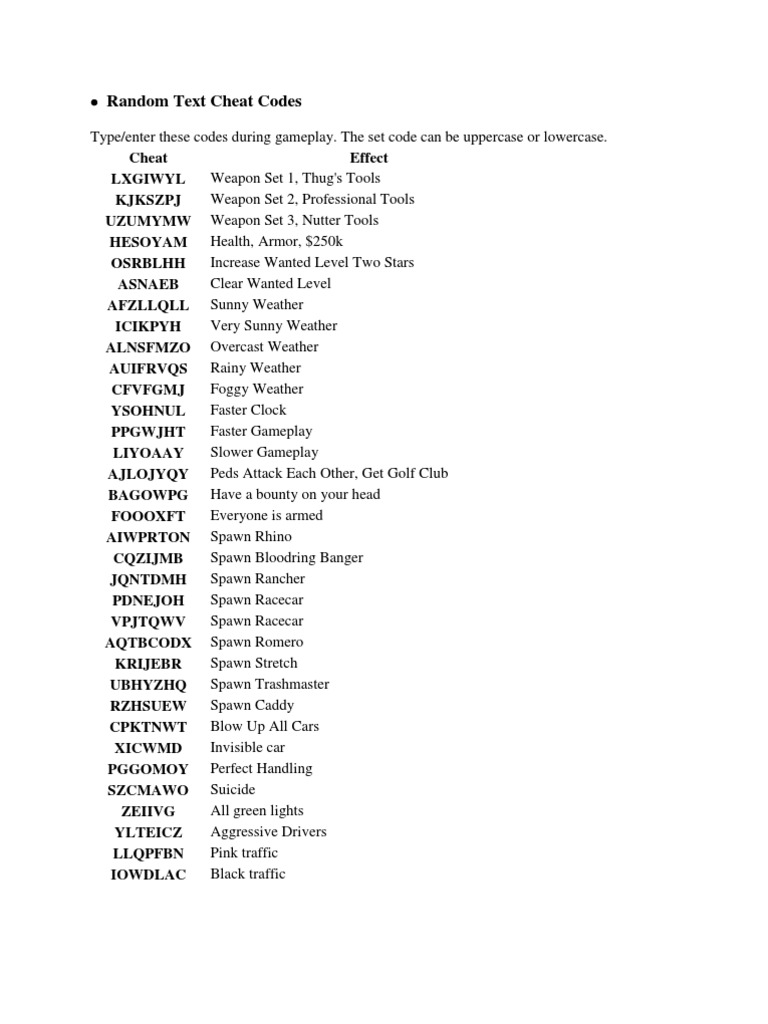 Cheat Effect OUIQDMW Full Weapon Aiming While Driving Reduced Traffic THGLOJ Traffic is Country Vehicles FVTMNBZ Recruit Anyone (9mm) SJMAHPE BMTPWHR Country Vehicles and Peds, Get Born 2 Truck Outfit Recruit Anyone (Rockets) ZSOXFSQ Max Respect OGXSDAG Max Sex Appeal EHIBXQS Taxis Have Nitrous, L3 Bunny Hop VKYPQCF Hitman In All Weapon Stats NCSGDAG Spawn Hunter OHDUDE AKJJYGLC Spawn Quad AMOMHRER Spawn Tanker Truck Spawn Dozer EEGCYXT Spawn Stunt Plane URKQSRK AGBDLCID Spawn Monster IFIRSTDOZ Never Wanted CAINEMVHZC Infinite Health, except for explosions and falls allcarsgoboom All Cars Explode PAINTITBLACK Black Traffic