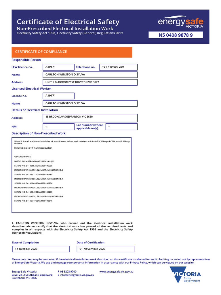 I, CARLTON WINSTON D'SYLVA, who carried out the electrical installation work