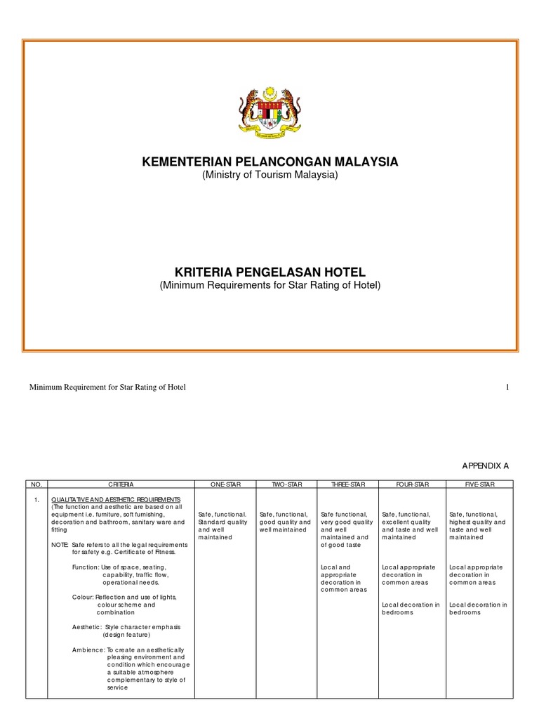 NO. 1. CRITERIA QUALITATIVE AND AESTHETIC REQUIREMENTS (The function and aesthetic are based on all equipment i.e. furniture, soft furnishing, decoration and bathroom, sanitary ware and fitting NOTE: Safe refers to all the legal requirements for safety e.g. Certificate of Fitness. Function: Use of space, seating, capability, traffic flow, operational needs. Colour: Reflection and use of lights, colour scheme and combination Aesthetic: Style character emphasis (design feature) Ambience: To create an aesthetically pleasing environment and condition which encourage a suitable atmosphere complementary to style of service ONE-STAR TWO-STAR THREE-STAR FOUR-STAR FIVE-STAR