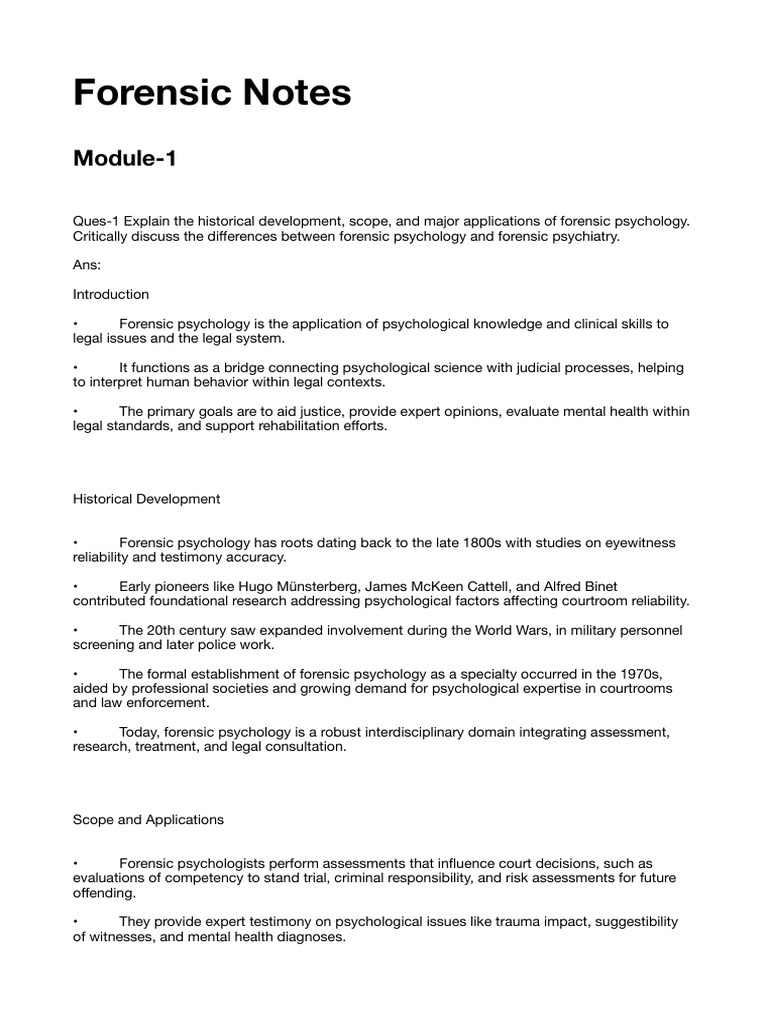 Ques-1 Explain the historical development, scope, and major applications of forensic psychology.