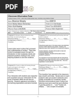 SHEET Teacher: ________________________________________________ Subject Area: ____________________________________________ School: _________________________________________________ Number of Pupils: _________________________________________ Criteria: 10 Outstanding 8 Very Satisfactory 6 Satisfactory 4 Unsatisfactory 10 I. Instructional Competence (70%) A. Lesson Planning and Delivery (45% for Teachers, 40% for Master Teachers) 1. Formulates/adopts objectives of lesson plan. Objectives formulated were specific, measurable, realistic and timely. 2. Select content and prepares appropriate instructional materials/teaching aids. Instructional materials/ teaching aids and content prepare/selected were adequate, congruent, appropriate, relevant and made od indigenous materials. 3. Selects teaching methods/strategies. Methods/strategies selected: were suitable to learning ability of the pupils; provides opportunity for greater participation of pupils; were varied and appropriate; maximized utilization of available audio-visual materials; and generated teacher-learner/learnerteacher interaction. 4. Relates new lesson with previous knowledge/skills. New lessons were retained with previous lessons/knowledge when a drill was conducted, a review/recall of previous lessons was conducted, questions from the past and present lessons were included and informal assessment of learning was used. 5. Provides appropriate motivation. Appropriate motivation was provided when appropriate audio-visual instructional materials were used, varied activities were utilized, pupils/students participation was enhanced, past and present lessons were related and interest of learners were sustained. 6. Presents and develops lessons. Presented and developed lessons according to objectives, using appropriate strategies, using varied teaching materials, by relating previous lessons to presents subjects matter and according to needs of the class. 7. Conveys ideas clearly. Ideas were clearly conveyed when: language/vocabulary used was within the level of the pupils/students, difficult/new vocabulary was unlocked before lesson proper, varied examples, strategies were used and pupils/students were responsive to questions asked, and pupils were able to use knowledge learned in other situations. 8. Utilizes the art of questioning to develop higher level of Date: ______________________ Time of Observation: _________
