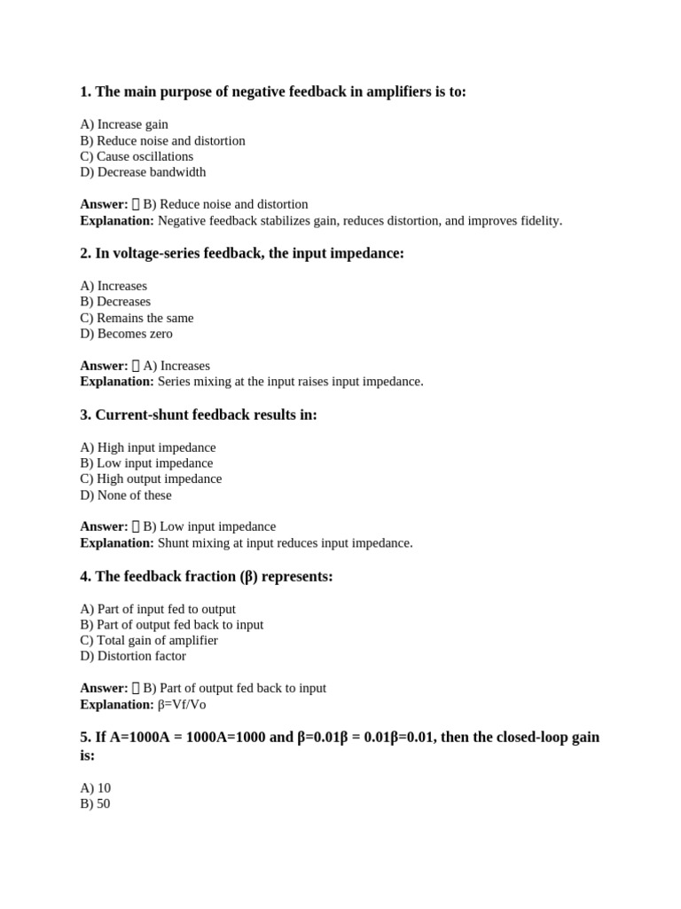 Explanation: Negative feedback stabilizes gain, reduces distortion, and improves fidelity.