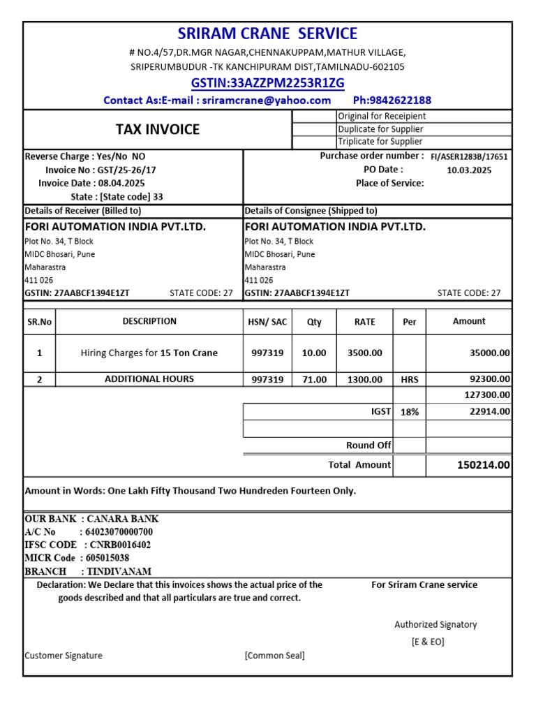 Declaration: We Declare that this invoices shows the actual price of the For Sriram Crane service