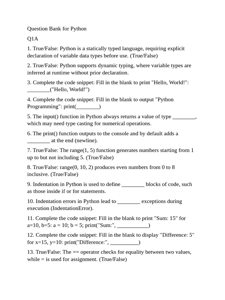 7. True/False: The range(1, 5) function generates numbers starting from 1