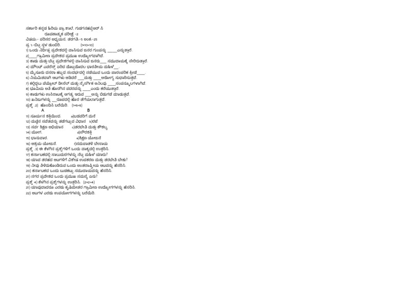 ವಿಷಯ:- ಪರಿಸರ ಅಧ್ಯಯನ, ತರಗತಿ:-5 ಅಂಕ:-25