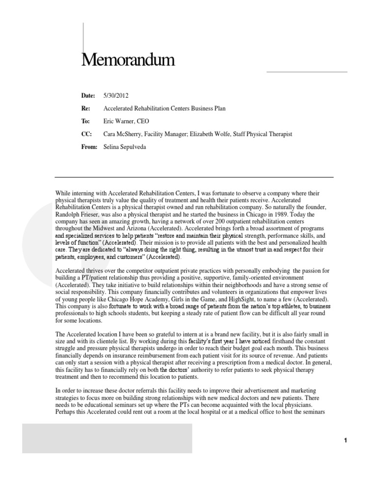 Date: Re: To: CC: 5/30/2012 Accelerated Rehabilitation Centers Business Plan Eric Warner, CEO Cara McSherry, Facility Manager; Elizabeth Wolfe, Staff Physical Therapist