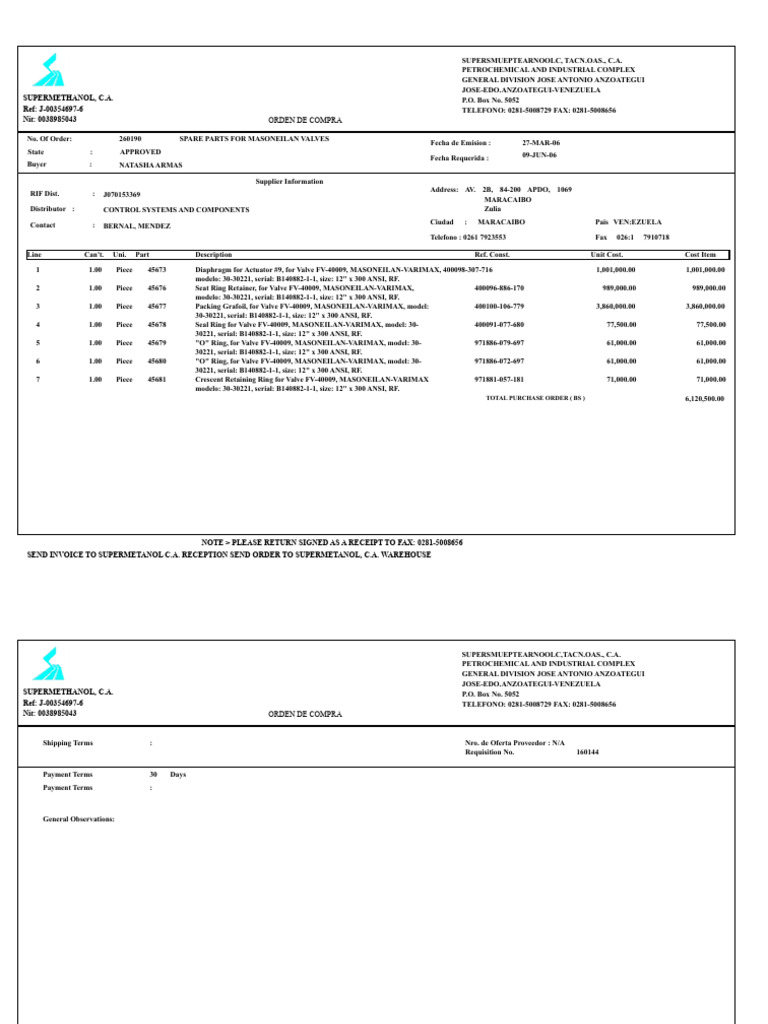 Orden de Compra: Supermethanol, C.A. Ref: J-00354697-6 Nit: 0038985043