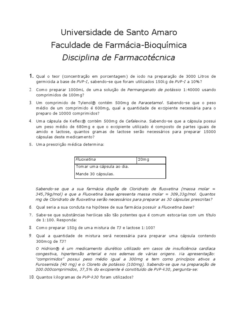 3. Um comprimido de Tylenol® contém 500mg de Paracetamol. Sabendo-se que o peso médio de um comprimido é 600mg, qual a quantidade de excipiente necessária para o preparo de 10000 comprimidos?