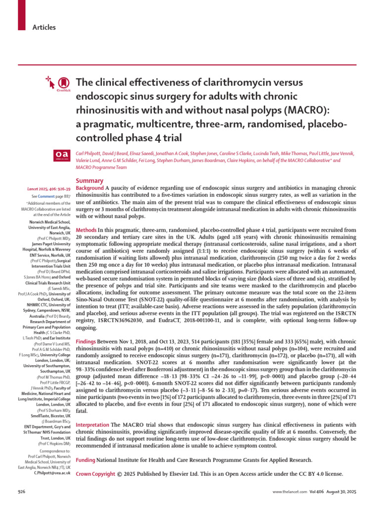 Lancet 2025; 406: 926–39 Background A paucity of evidence regarding use of endoscopic sinus surgery and antibiotics in managing chronic