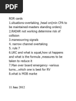 why sluggish response in shallow water..... a no. of cards........ deep water anchoring Questions as ed by Capt.daniel chandran on 12-oct.. function 1 1. How will you assist your master during navigation when the ship is in TRS. 2. When all do you expect the master to be on bridge during navigation. 3. What all inputs do u give to your 2nd mate as a C/O during voyage planning. 4. On your ship who does the voyage planning ? 5. What is the principle of the gyro ? 6. What is a gyrosphere..? 7. What is the principle of a magnetic compass ? 8. How do u navigate using the celestial objects ? 9. How do u fix a position during day time ? 10. How do u fix a postion at night using stars ? 11. Explain the entire procedure of ta ing sight at night using the stars ? 12. How will u get the compass error using terrestrial objects ? 13. What are the limitations of the radar ? 14. What errors can u expect while using the radar ? 15. What do u mean by compass course ? 16. What buoyage sytem is used in india ? 17. What buoy will you have on your left side while entering Chennai port ? CAPT. ARAVIND GANGADARAN on 11.11.11-ORALS Function 1 1) How will you determine whether ris of collision exist? 2) Definition-CBD, RAM, & Restricted visibility? 3) Restricted visibility in Dover Strait precaution? 4) Own Vsl in TSS west bound, another power driven vsl on your stbd bow after d ropping pilot approaching TSS to join east bound lane- Can she cross the TSS? w hile crossing ris of collision exist, whose responsibility to eep clear? 5)Range of fog signal? 6)Own vsl CBD and has another power driven vsl on stbd bow crossing in shallow water, who has to ta e action? 7) Auto pilot controls?