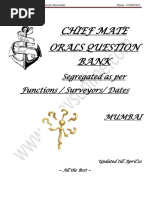 Fn 1 Wht to chec in a passage plan as a mate? Master tells to approve a passage plan, hw to go abt? Hw to decide whether to use Rhumb line or Great Circle? Polar navigation, problems faced? Why Gyro and magnetic compass useless in High latitudes? Heavy Weather precautions as a mate? TLD/TRS difference? What are fronts, hw are they formed? What are currents, different types of Current? Assist Master with command decision?? Hw to anchor a vessel? Anchoring in deep waters, hw to determine the lenght pf cable to be used? Precautions while Wal ing bac anchor? Interaction with Tug, reasons? Ships routeing, hw will u carry out? Parametric rolling/ Synchronus Rolling, Actions? Why large flare for Containers? following seas, wht are the hazards/precautions? Date 19-Dec-2011 Venue : MMD Chennai. External Examiner : Capt Arvinder Sibin Gangadharan Internal Examiner : Capt Solan i. Func-1 1.Define CBD, Restricted Visib, RAM , NUC ? 2.Nav lights of NUC, RAM , CBD - Day Signal for the same .. 3.10 ROR Cards including Buoys. 4. Six Situations mainly in TSS and Restricted visib. 5. What is ECDIS? 6. What is the difference between Raster & Vector Chart? 7. What are the different methods of obtaining a compass error? 8. What is Synoptic Chart? 9. Define TRS? 10. Which is the dangerous quadraent in the TRS? 11. what are the various control settings in the auto pilot? 12. What is ALRS? How many volumes of ALRS are there? on 15th, monday. orals ta en by Capt Kumar, and capt Solan i......... fn 1:RAM NUC headon.....action as per rules..... visibility 3 miles, crossing action(i as ed the surveyor for the range between 2 vsls and he was happy) a no. of RV situation.... difference between avoid impedeing passage vs avoid impeding safe passage.... CBD crossing action........ dredging anchor.... cargo shift action.... wats BTM.... different types of messages(distress, urgency, safety, routine).... no. of cards.... how to berth with onshore winds....