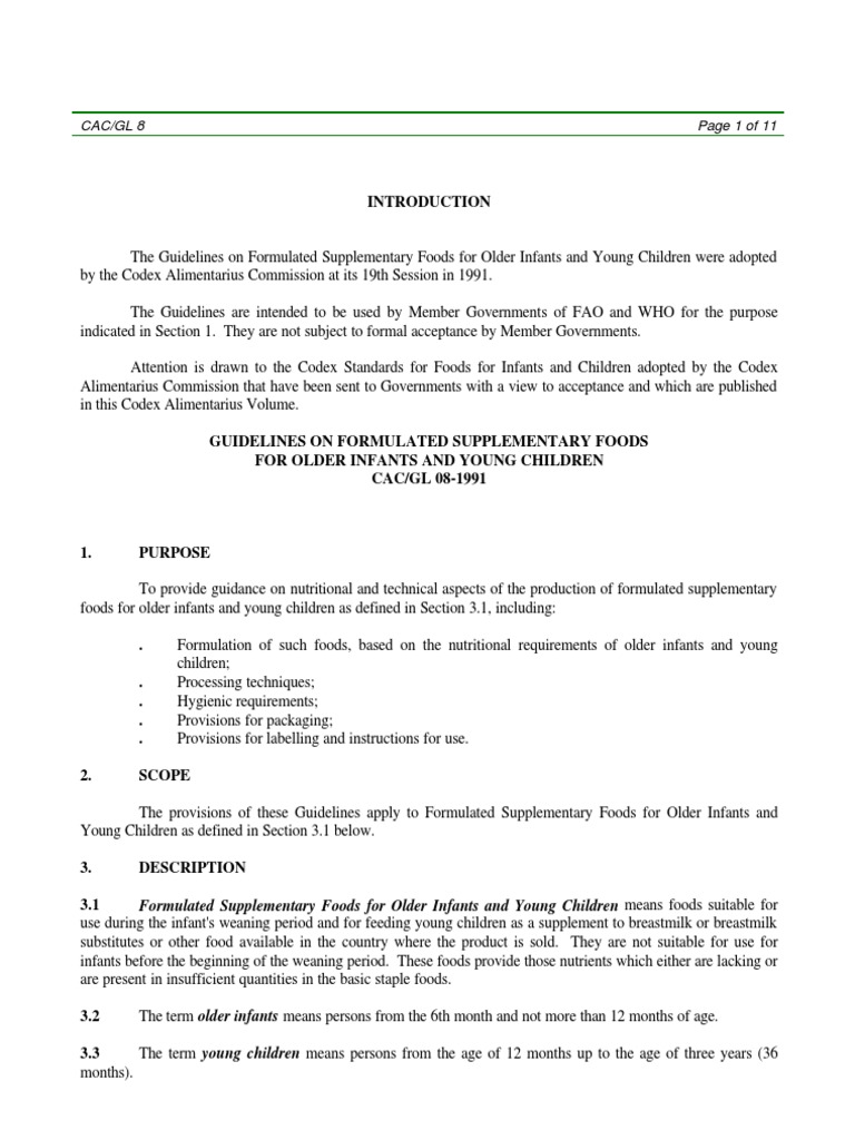 The Guidelines on Formulated Supplementary Foods for Older Infants and Young Children were adopted by the Codex Alimentarius Commission at its 19th Session in 1991. The Guidelines are intended to be used by Member Governments of FAO and WHO for the purpose indicated in Section 1. They are not subject to formal acceptance by Member Governments. Attention is drawn to the Codex Standards for Foods for Infants and Children adopted by the Codex Alimentarius Commission that have been sent to Governments with a view to acceptance and which are published in this Codex Alimentarius Volume. GUIDELINES ON FORMULATED SUPPLEMENTARY FOODS FOR OLDER INFANTS AND YOUNG CHILDREN CAC/GL 08-1991