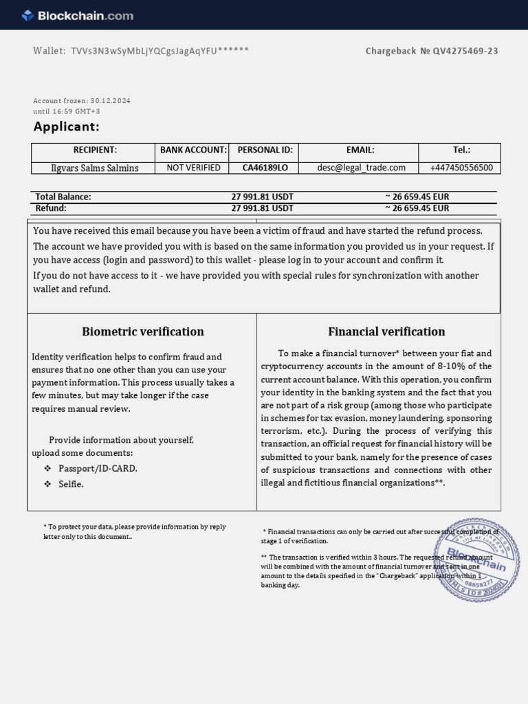 Wallet: TVVs3N3wSyMbLjYQCgsJagAqYFU****** Chargeback № QV4275469-23