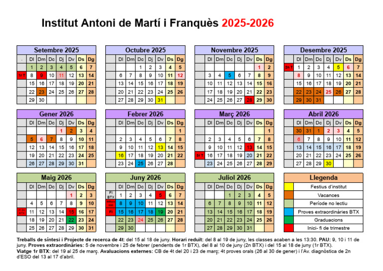 juny. Proves extraordinàries: 5 de novembre i 25 de febrer (pendents de 1r BTX), del 8 al 10 de juny (2n BTX) i del 15 al 18 de juny (1r BTX).