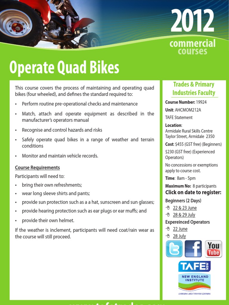 This course covers the process of maintaining and operating quad bikes (four wheeled), and defines the standard required to: Perform routine pre-operational checks and maintenance Match, attach and operate equipment as described in the manufacturers operators manual Recognise and control hazards and risks Safely operate quad bikes in a range of weather and terrain conditions Monitor and maintain vehicle records. Course Requirements Participants will need to: bring their own refreshments; wear long sleeve shirts and pants; provide sun protection such as a a hat, sunscreen and sun glasses; provide hearing protection such as ear plugs or ear muffs; and provide their own helmet. If the weather is inclement, participants will need coat/rain wear as the course will still proceed.