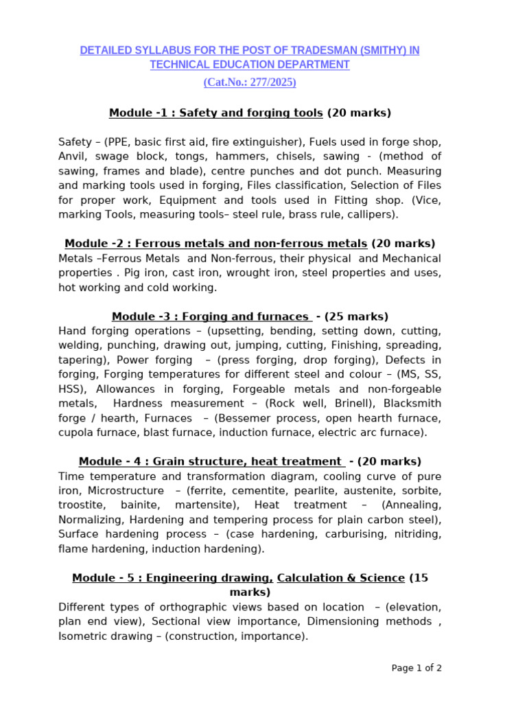 DETAILED SYLLABUS FOR THE POST OF TRADESMAN (SMITHY) IN