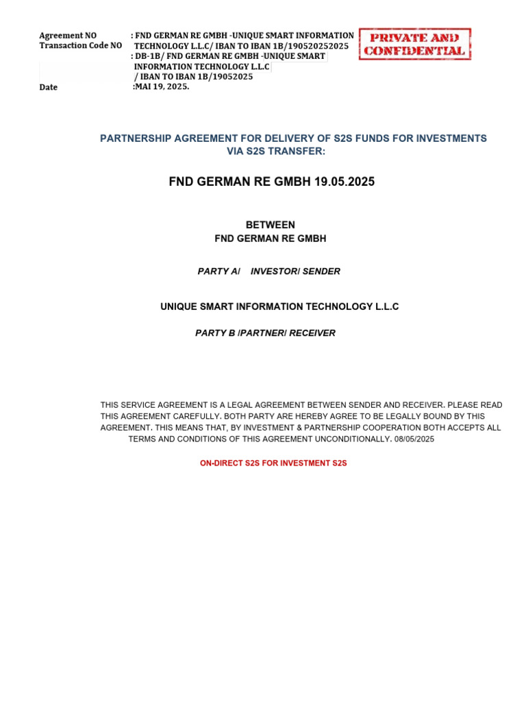 PARTNERSHIP AGREEMENT FOR DELIVERY OF S2S FUNDS FOR INVESTMENTS VIA S2S: