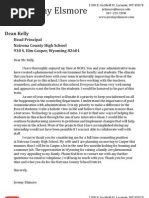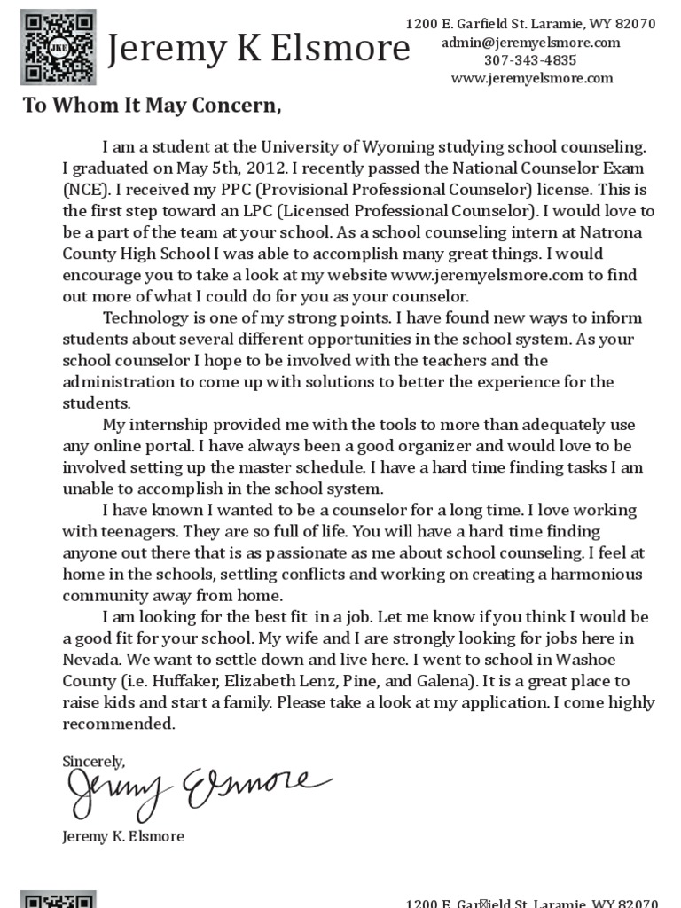I am a student at the University of Wyoming studying school counseling. I graduated on May 5th, 2012. I recently passed the National Counselor Exam (NCE). I received my PPC (Provisional Professional Counselor) license. This is the irst step toward an LPC (Licensed Professional Counselor). I would love to be a part of the team at your school. As a school counseling intern at Natrona County High School I was able to accomplish many great things. I would encourage you to take a look at my website www.jeremyelsmore.com to ind out more of what I could do for you as your counselor. Technology is one of my strong points. I have found new ways to inform students about several different opportunities in the school system. As your school counselor I hope to be involved with the teachers and the administration to come up with solutions to better the experience for the students. My internship provided me with the tools to more than adequately use any online portal. I have always been a good organizer and would love to be involved setting up the master schedule. I have a hard time inding tasks I am unable to accomplish in the school system. I have known I wanted to be a counselor for a long time. I love working with teenagers. They are so full of life. You will have a hard time inding anyone out there that is as passionate as me about school counseling. I feel at home in the schools, settling conlicts and working on creating a harmonious community away from home. I am looking for the best it in a job. Let me know if you think I would be a good it for your school. My wife and I are strongly looking for jobs here in Nevada. We want to settle down and live here. I went to school in Washoe County (i.e. Huffaker, Elizabeth Lenz, Pine, and Galena). It is a great place to raise kids and start a family. Please take a look at my application. I come highly recommended.