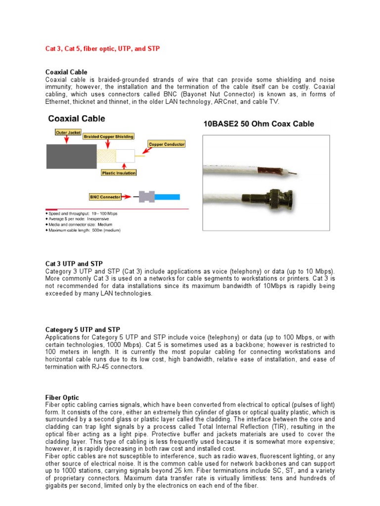 Cat 3, Cat 5, fiber optic, UTP, and STP
