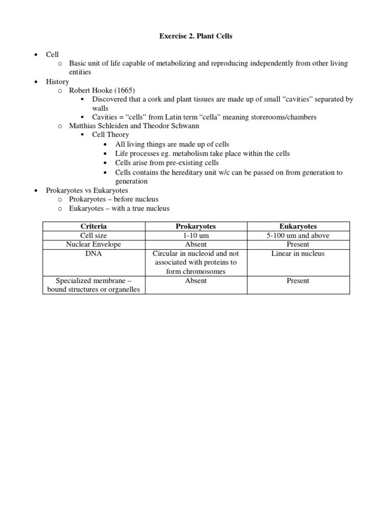 Plant Cells Cell o Basic unit of life capable of metabolizing and reproducing independently from other living entities History o Robert Hooke (1665) Discovered that a cork and plant tissues are made up of small cavities separated by walls Cavities = cells from Latin term cella meaning storerooms/chambers o Matthias Schleiden and Theodor Schwann Cell Theory All living things are made up of cells Life processes eg. metabolism take place within the cells Cells arise from pre-existing cells Cells contains the hereditary unit w/c can be passed on from generation to generation Prokaryotes vs Eukaryotes o Prokaryotes before nucleus o Eukaryotes with a true nucleus Criteria Cell size Nuclear Envelope DNA Prokaryotes 1-10 um Absent Circular in nucleoid and not associated with proteins to form chromosomes Absent Eukaryotes 5-100 um and above Present Linear in nucleus