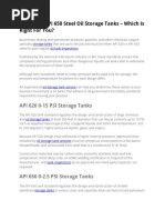 API-620 Tanks are welded, low pressure storage tanks designed to contain petroleum intermediates and finished products, as well as other liquid products handles and stored by the petroleum industry. API-620 tanks can be designed up to but not beyond 14.9 PSIG and with proper application of appendix Q criteria, covers low pressure storage of liquefied hydrocarbon gases at temperatures as low as 270oF. The API-620 standard assists engineers in determining shell course thicknesses, anchorage, corrosion allowances and other critical design factors. All API-620 Ta n k s manufactured by LIDE Industries are tested according to requirements of the API-620 standards and are covered u n d e r L I D E s s t a n d a r d warranty.
