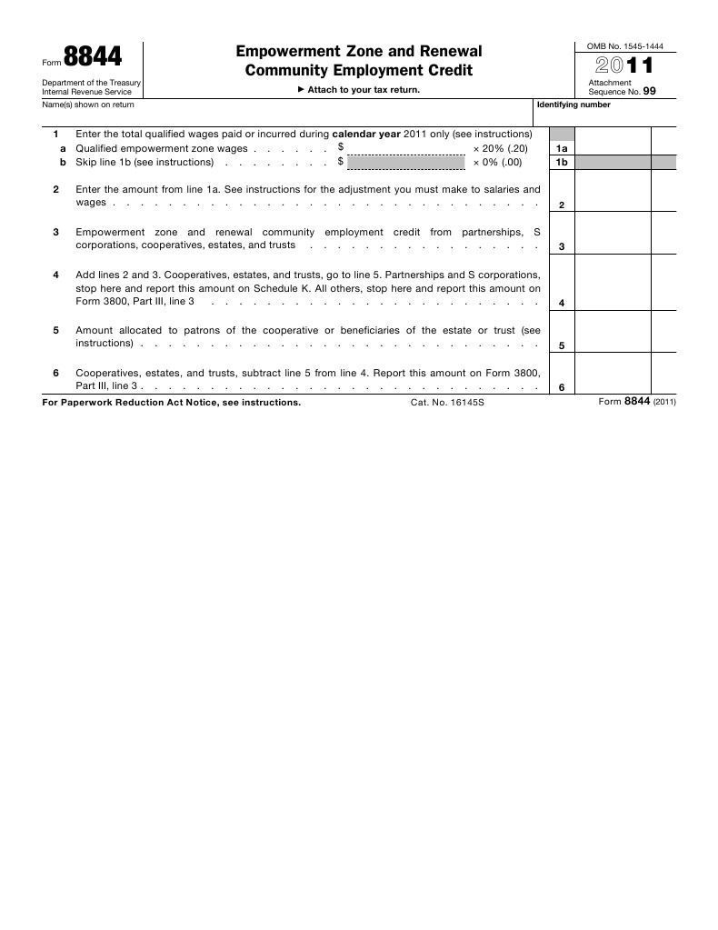Use Form 8844 to claim the empowerment zone and renewal community employment (EZRCE) credit. For tax years that include December 31, 2011, the credit is 20% of the employers qualified wages (up to $15,000) paid or incurred during calendar year 2011 on behalf of qualified empowerment zone employees. The credit is a component of the general business credit, and a special tax liability limit applies. The allowable credit is figured in Part II of Form 3800, General Business Credit.