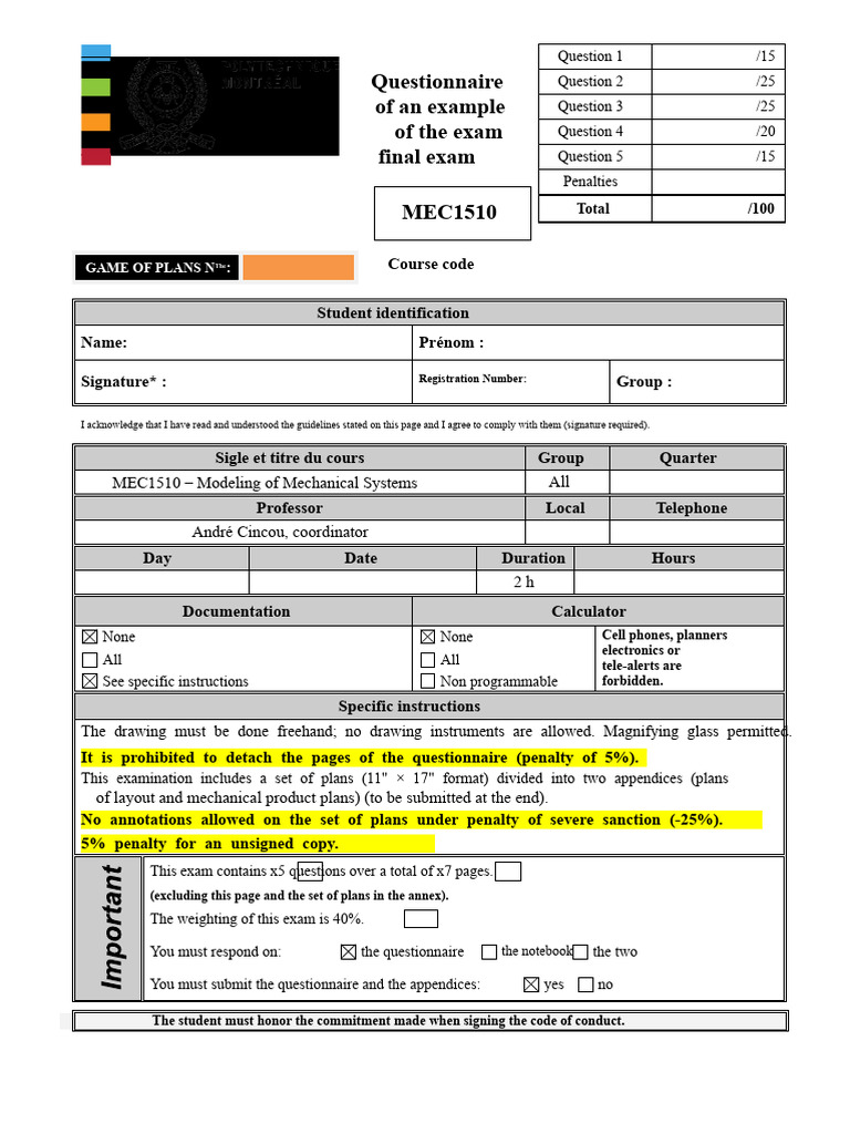 MEC1510 – MODELING OF MECHANICAL SYSTEMS – EXAMPLE OF A FINAL EXAM PAGE 1 OF 7