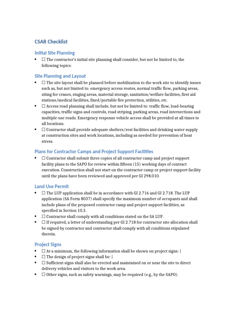 ☐ The contractor’s initial site planning shall consider, but not be limited to, the