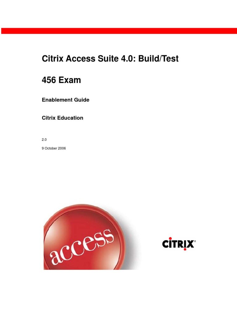 This document provides a list of exam objectives for the Citrix Access Suite 4.0: Build/Test Exam (456) and a list of resources that will help prepare exam-takers for the simulation and multiple-choice items associated with these objectives. This document outlines, at a high level, topics covered in the exam and instruction on how to obtain information about these topics. Exam-takers should read this document carefully before beginning preparation for the exam. This exam certifies that successful candidates have the knowledge and skills necessary to build and test a Citrix Access Suite 4.0 implementation.