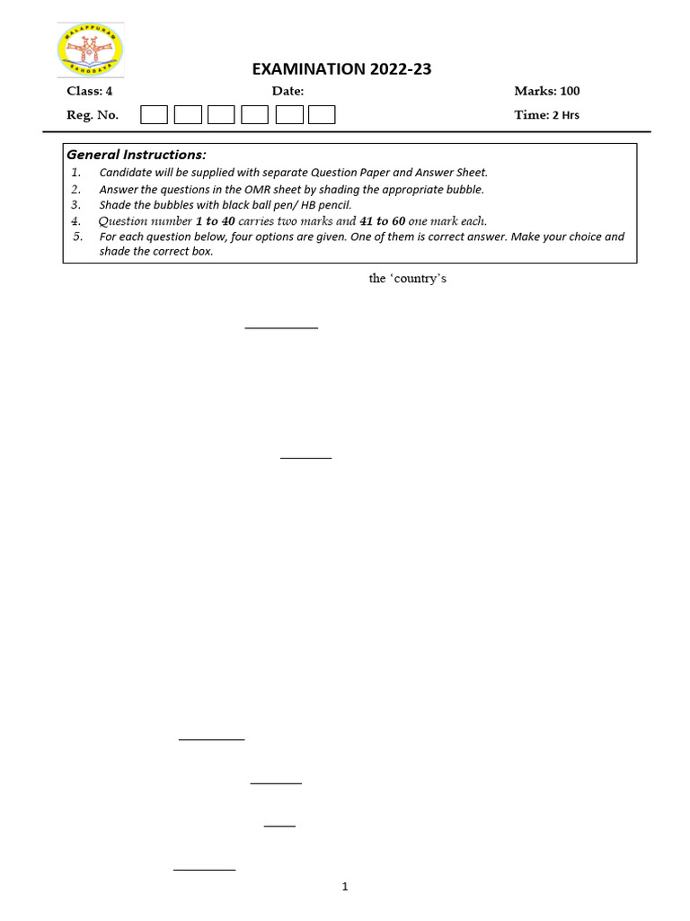 Class: 4 Date: Marks: 100