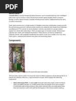 ernal and external applications. To prevent a clandestine attack using a seconda ry light source being used to hold the detector in a 'sealed' condition whilst a n intruder passes through, most systems use and detect a modulated light source. [edit]Glass break detectors The glass break detector may be used for internal perimeter building protection. When glass breaks it generates sound in a wide band of frequencies. These can r ange from infrasonic, which is below 20 hertz (Hz) and can not be heard by the h uman ear, through the audio band from 20 Hz to 20 kHz which humans can hear, rig ht up to ultrasonic, which is above 20 kHz and again cannot be heard. Glass brea k acoustic detectors are mounted in close proximity to the glass panes and liste n for sound frequencies associated with glass breaking. Seismic glass break dete ctors are different in that they are installed on the glass pane. When glass bre aks it produces specific shock frequencies which travel through the glass and of ten through the window frame and the surrounding walls and ceiling. Typically, t he most intense frequencies generated are between 3 and 5 kHz, depending on the type of glass and the presence of a plastic interlayer. Seismic glass break dete ctors feel these shock frequencies and in turn generate an alarm condition. The more primitive detection method involves gluing a thin strip of conducting f oil on the inside of the glass and putting low-power electrical current through it. Breaking the glass is practically guaranteed to tear the foil and break the circuit. [edit]Smoke, heat, and carbon monoxide detectors Heat detection system Most systems may also be equipped with smoke, heat, and/or carbon monoxide detec tors. These are also known as 24 hour zones (which are on at all times). Smoke d etectors and heat detectors protect from the risk of fire and carbon monoxide de tectors protect from the risk of carbon monoxide. Although an intruder alarm pan el may also have these detectors connected, it may not meet all the local fire c ode requirements of a fire alarm system. [edit]Outdoor These types of sensors would be found most of the time mounted on fences or inst alled on the perimeter of the protected area. [edit]Vibration (shaker) or inertia sensors These devices are mounted on barriers and are used primarily to detect an attack on the structure itself. The technology relies on an unstable mechanical config uration that forms part of the electrical circuit. When movement or vibration oc curs, the unstable portion of the circuit moves and breaks the current flow, whi ch produces an alarm. The technology of the devices varies and can be sensitive to different levels of vibration. The medium transmitting the vibration must be correctly selected for the specific sensor as they are best suited to different types of structures and configurations. A rather new and unproven type of sensors use piezo-electric components rather t han mechanical circuits, which can be tuned to be extremely sensitive to vibrati on. pros: Very reliable sensors, low false alarm rate and middle place in the price range. cons: Must be fence mounted. The rather high price deters many customers, but it s effectiveness offsets its high price. Piezo-electric sensors are a new technol ogy with an unproven record as opposed to the mechanical sensor which in some ca ses has a field record in excess of 20 years. [edit]Passive magnetic field detection This buried security system is based on the Magnetic Anomaly Detection principle of operation. The system uses an electromagnetic field generator powered by two wires running in parallel. Both wires run along the perimeter and are usually i nstalled about 5 inches apart on top of a wall or about 12"/30 cm below ground. The wires are connected to a signal processor which analyzes any change in the m agnetic field.