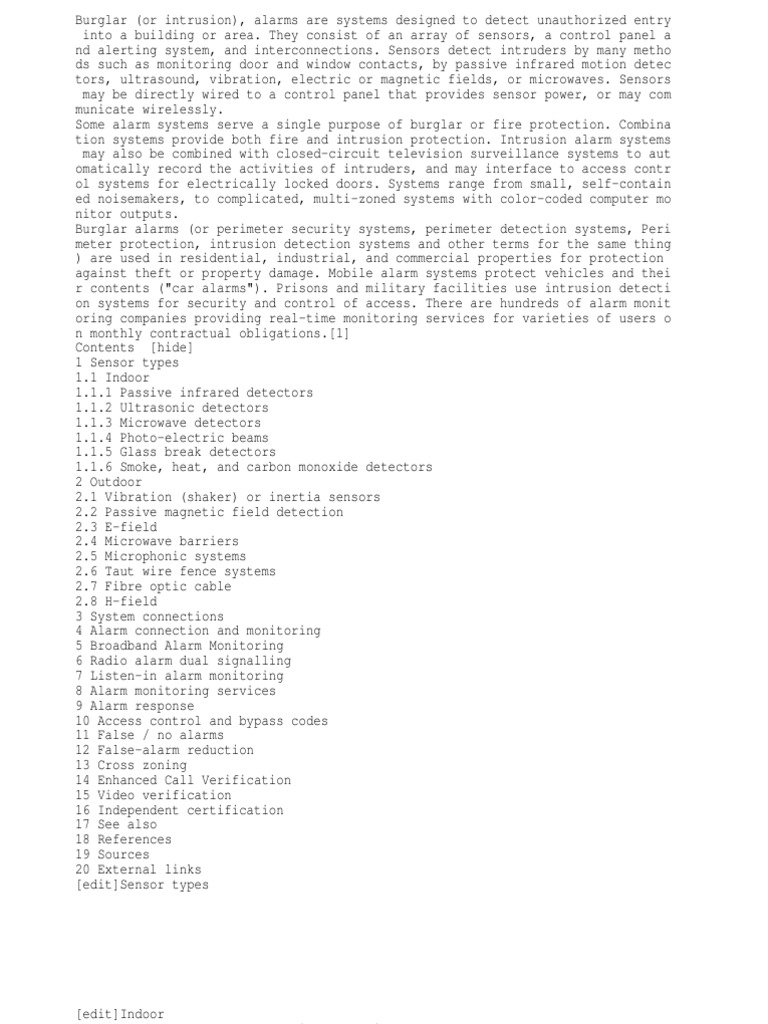 They consist of an array of sensors, a control panel a nd alerting system, and interconnections. Sensors detect intruders by many metho ds such as monitoring door and window contacts, by passive infrared motion detec tors, ultrasound, vibration, electric or magnetic fields, or microwaves. Sensors may be directly wired to a control panel that provides sensor power, or may com municate wirelessly. Some alarm systems serve a single purpose of burglar or fire protection. Combina tion systems provide both fire and intrusion protection. Intrusion alarm systems may also be combined with closed-circuit television surveillance systems to aut omatically record the activities of intruders, and may interface to access contr ol systems for electrically locked doors. Systems range from small, self-contain ed noisemakers, to complicated, multi-zoned systems with color-coded computer mo nitor outputs. Burglar alarms (or perimeter security systems, perimeter detection systems, Peri meter protection, intrusion detection systems and other terms for the same thing ) are used in residential, industrial, and commercial properties for protection against theft or property damage. Mobile alarm systems protect vehicles and thei r contents ("car alarms"). Prisons and military facilities use intrusion detecti on systems for security and control of access. There are hundreds of alarm monit oring companies providing real-time monitoring services for varieties of users o n monthly contractual obligations.[1] Contents [hide] 1 Sensor types 1.1 Indoor 1.1.1 Passive infrared detectors 1.1.2 Ultrasonic detectors 1.1.3 Microwave detectors 1.1.4 Photo-electric beams 1.1.5 Glass break detectors 1.1.6 Smoke, heat, and carbon monoxide detectors 2 Outdoor 2.1 Vibration (shaker) or inertia sensors 2.2 Passive magnetic field detection 2.3 E-field 2.4 Microwave barriers 2.5 Microphonic systems 2.6 Taut wire fence systems 2.7 Fibre optic cable 2.8 H-field 3 System connections 4 Alarm connection and monitoring 5 Broadband Alarm Monitoring 6 Radio alarm dual signalling 7 Listen-in alarm monitoring 8 Alarm monitoring services 9 Alarm response 10 Access control and bypass codes 11 False / no alarms 12 False-alarm reduction 13 Cross zoning 14 Enhanced Call Verification 15 Video verification 16 Independent certification 17 See also 18 References 19 Sources 20 External links [edit]Sensor types