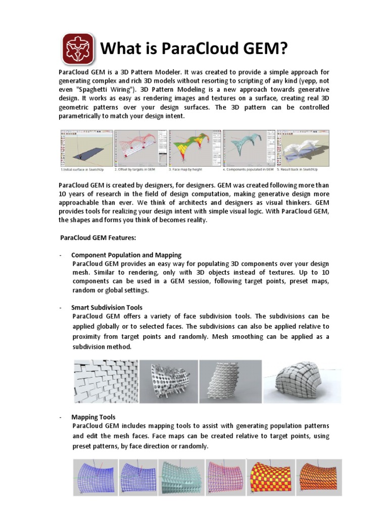 ParaCloud GEM is created by designers, for designers. GEM was created following more than 10 years of research in the field of design computation, making generative design more approachable than ever. We think of architects and designers as visual thinkers. GEM provides tools for realizing your design intent with simple visual logic. With ParaCloud GEM, the shapes and forms you think of becomes reality. ParaCloud GEM Features: Component Population and Mapping ParaCloud GEM provides an easy way for populating 3D components over your design mesh. Similar to rendering, only with 3D objects instead of textures. Up to 10 components can be used in a GEM session, following target points, preset maps, random or global settings. Smart Subdivision Tools ParaCloud GEM offers a variety of face subdivision tools. The subdivisions can be applied globally or to selected faces. The subdivisions can also be applied relative to proximity from target points and randomly. Mesh smoothing can be applied as a subdivision method.
