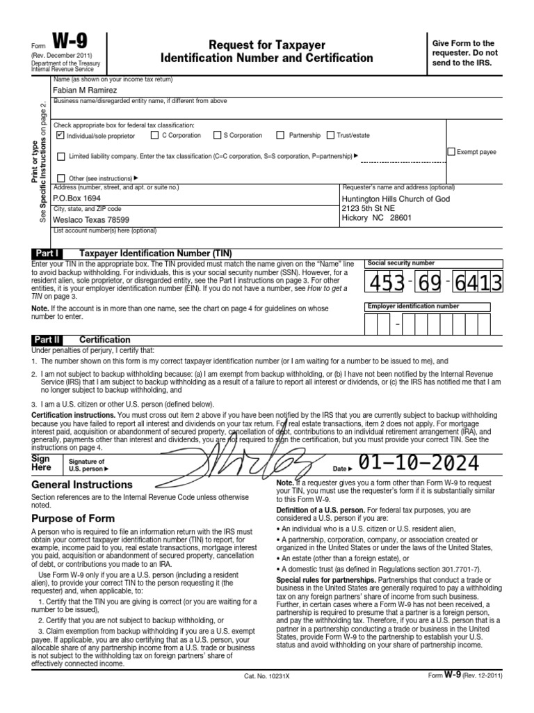 Department of the Treasury Identification Number and Certification send to the IRS.