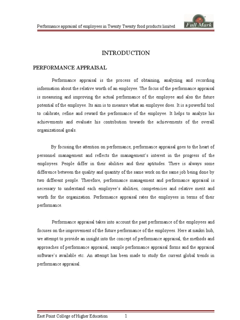 Performance appraisal may be understood as the assessment of an individuals performance in a systematic way. The performance being measured against such factors as job knowledge, quality and quantity of output, initiative, leadership abilities, supervision, dependability, co-operation, judgement, versatility, health and the like. It is also help the developing the strengths & weakness of the employees Twenty Twenty food products Ltd have been conducting performance appraisal for the past four years. From the study it has been indentified that the performance appraisal is able to identify employees potential and find the motivating factors of employees. The major drawback is in terms of the appraiser and his knowledge regarding employees job responsibilities and duties.